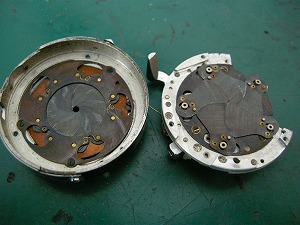 されに絞りとシャッター部に分けたところです。 今回のカメラは絞り羽根やシャッター羽根に油はまわっていませんでしたが、汚れとさびが浮いています。 |