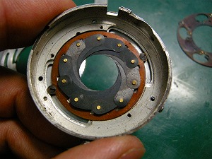 次はヘリコイドのグリスアップです。ヘリコイド越しに絞り羽根とシャッターユニットが組みつけられてヘリコイド完成を待ってます。 |