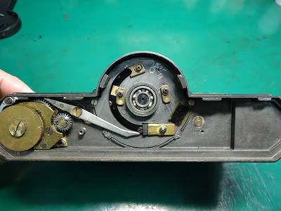 上カバーを外しますと右側に巻き上げユニット。 左側にシャッター速度の制御部分(ガバナー)。 中央に巻き上げとレンズユニット、そしてガバナーをつなぐ大きなギヤが見えます。 ギヤの下にゼンマイがあり、その下にカメラ下側と同様にレンズユニットのボール軸受があります。 ファインダーは上カバーに付いて一緒に外れます。 |