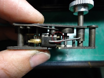 次に不具合がありましたガバナーの清掃とグリス入れ替えを行います。 ガバナーの上カバーをはずしたところです。 赤丸部分、ギヤ軸を固定している部品が無くなって不具合が出てましたので組み上げ時にネジを補充します。 |