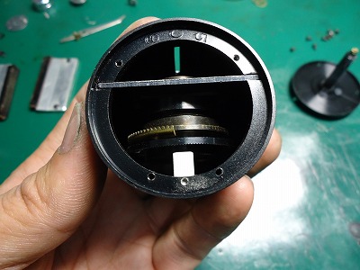 レンズは丸い筒に入っています。 画像上がフィルム側になり、光を通すスリットが見えます。 |